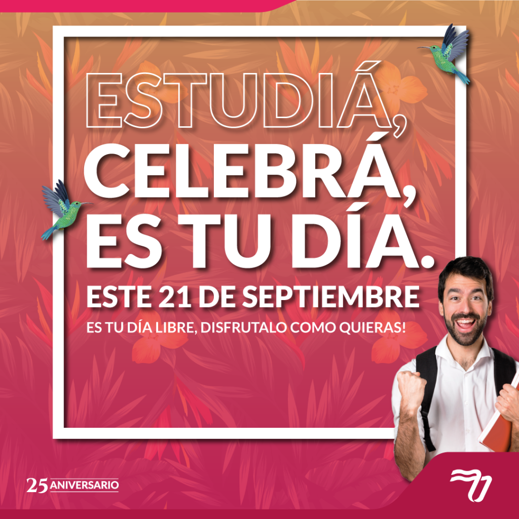 Informamos a la comunidad estudiantil de la Universidad de la Cuenca del Plata que el 21 de septiembre no se dictarán clases en ninguna sede de la Universidad con motivo de los festejos del Día del Estudiante, a fin de que los alumnos puedan disfrutar y celebrar su día.